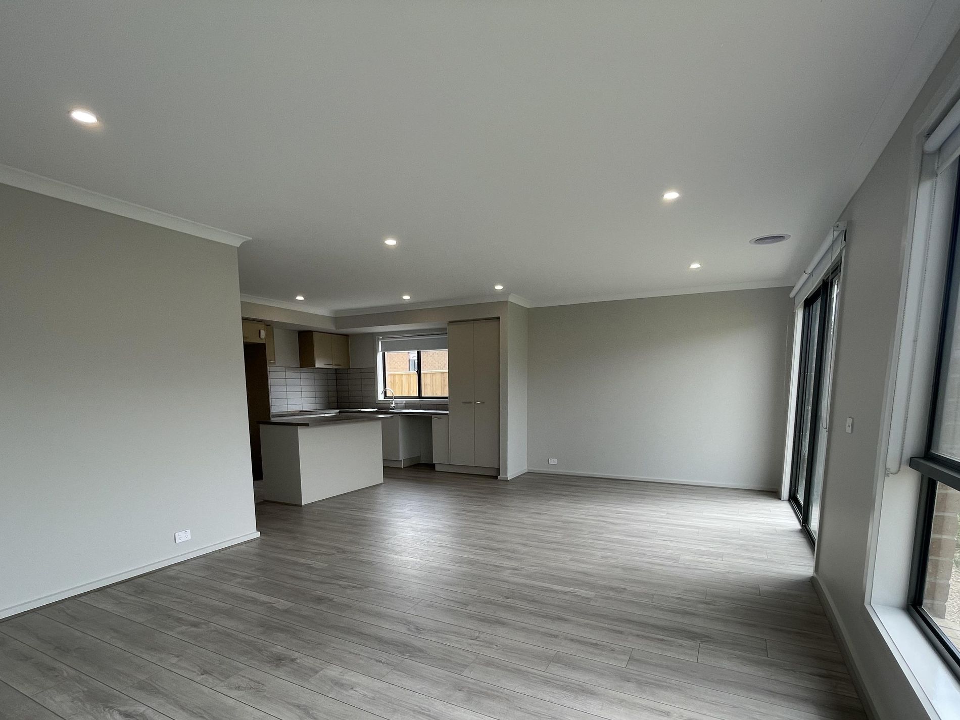 Open-plan kitchen, dining, and living area with backyard access