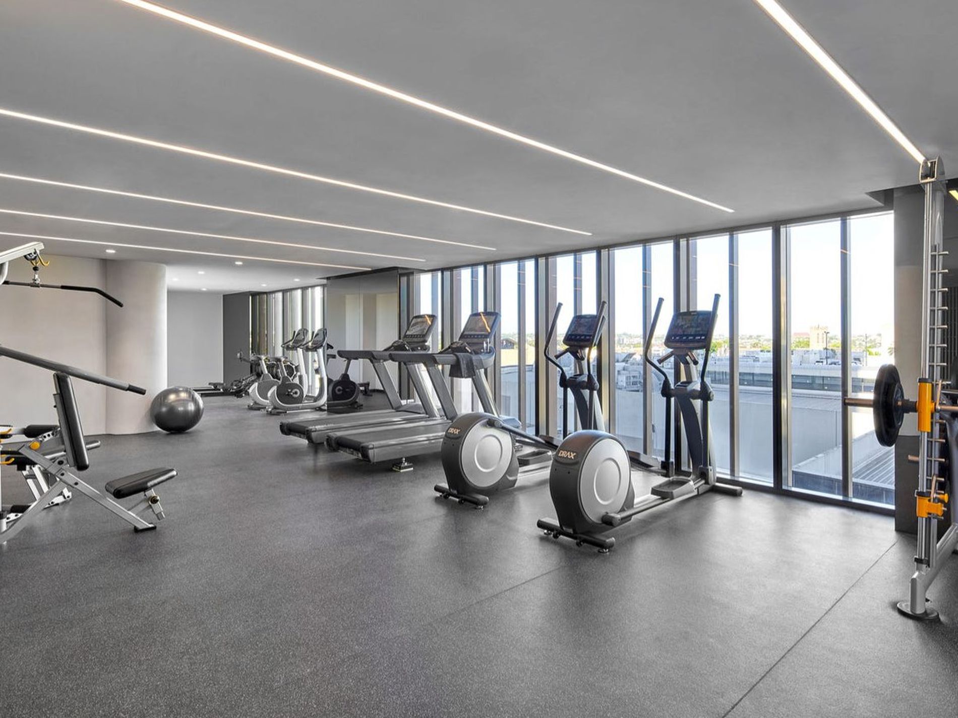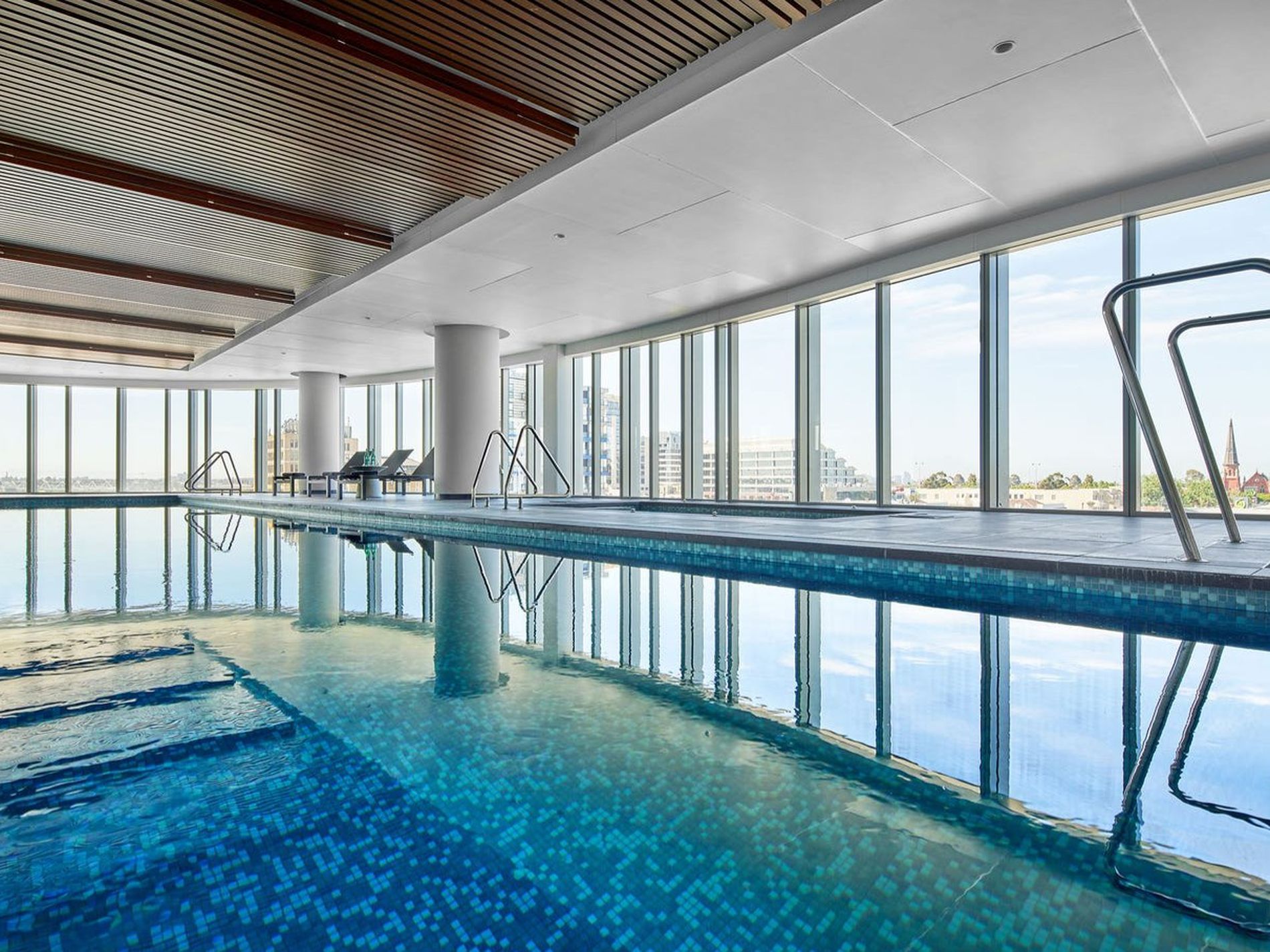 Residents enjoy access to an indoor heated pool, gym, yoga room, sports court, BBQ area, and concierge service.