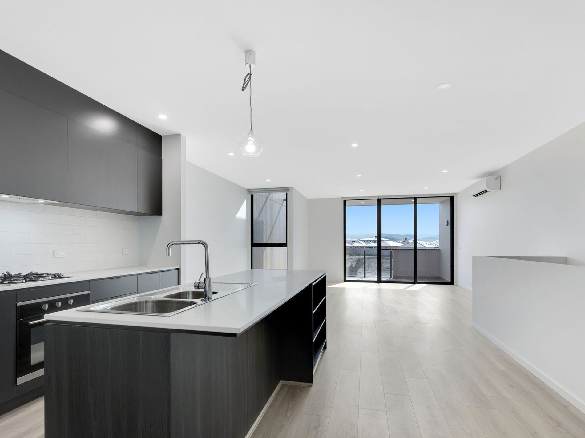 Upstairs features open-plan living and dining opening to a large balcony with hill views, a sleek kitchen with stainless steel appliances and Caesarstone island, plus a main bedroom with ensuite and built-in robes. Two additional bedrooms and a central bathroom are located downstairs, along with internal access to a double garage.